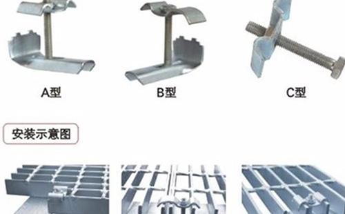 B型:由一塊帶雙鉤的上壓板(其中一個鉤可將相鄰的兩塊鋼格板括在一起),一塊帶齒的下壓板和一支>M8的內(nèi)角螺栓組成。