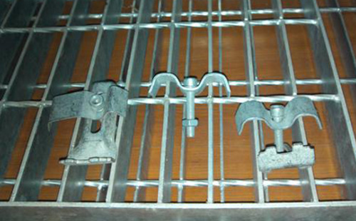B型:由一塊帶雙鉤的上壓板(其中一個鉤可將相鄰的兩塊鋼格板括在一起),一塊帶齒的下壓板和一支>M8的內角螺栓組成。
